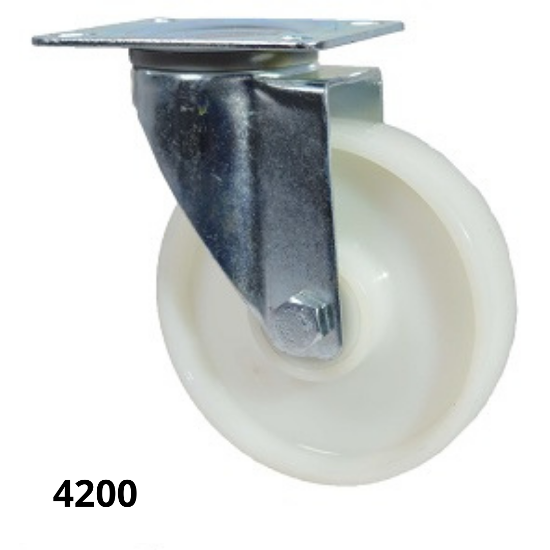 Ruedas con soporte – serie M reforzada – soporte giratorio – plato para 4 tornillos.